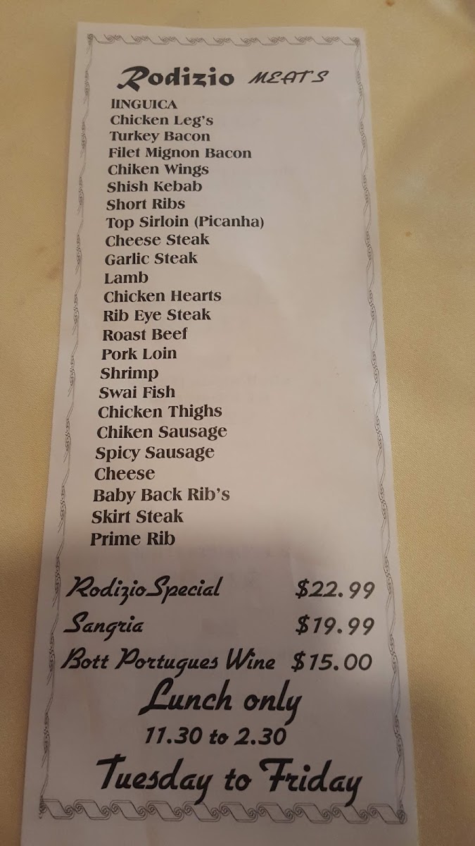 Additionally, the menu boasts diverse appetizers like the Ameijoas À "Bulhão Pato", clams stewed in garlic and cilantro. Guests rave about the generous portions, exemplified by the remarkable Rodizio, which showcases an array of perfectly seasoned grilled meats. Diners consistently highlight the rodizio experience as a "fantastic" option, perfect for sharing and savoring together.
